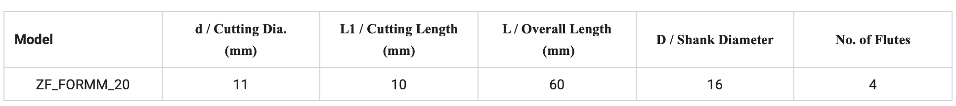 产品特色: * Solid Carbide Material * Uncoated 4-Flute * Capable of Form Milling * Suitable materials: Aluminum Alloy, Stainless Steel, Hardened Steel / Tool Steel * Applications: Aerospace, Consumer Electronics, Automotive, Industrial Machinery, Medical Devices, and various other industries.